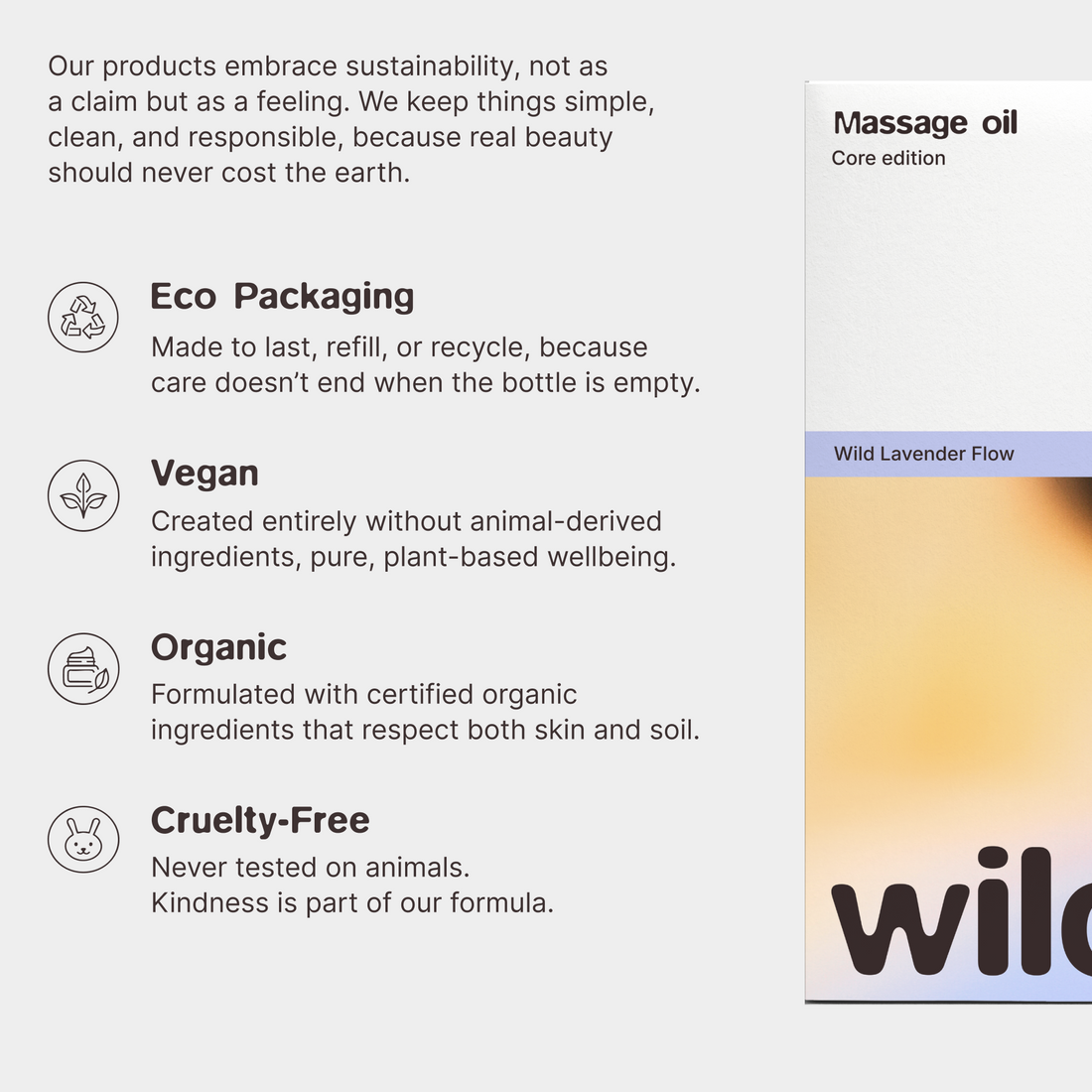 Every Wild creation is consciously made — from organic ingredients to recyclable packaging and ethically sourced botanicals. Our promise is transparency, traceability, and respect — for people, nature, and everything in between.